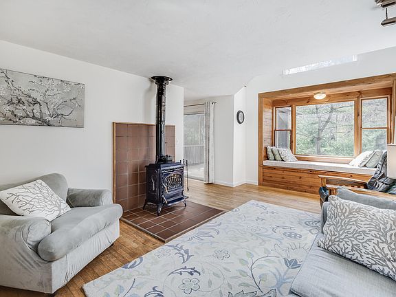Wood burning stoveHardwood floorsSun filled screened porchCozy window seatFenced yardTreed yard