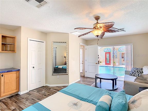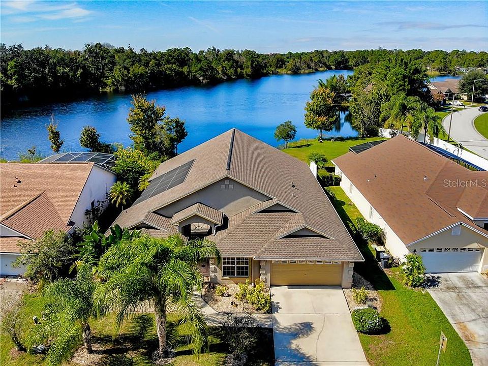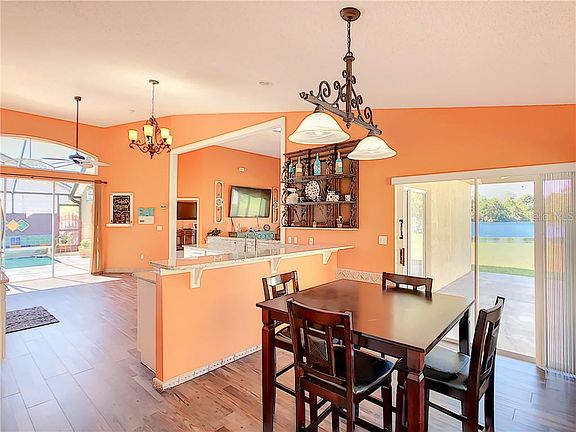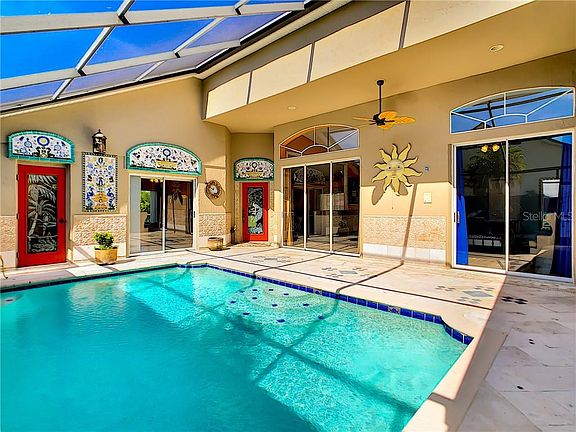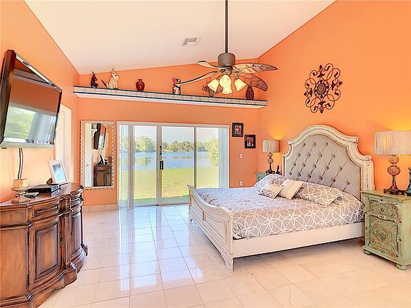 Big Open Bright Breezy 4 bedroom 3.5 bath former Builder Model with serene lake or pool views from nearly every room. Reminiscent of a Mediterranean vacation villa, the gated entry to a private courtyard has a south-facing heated pool with sliding patio door access to living room, master suite, in-law suite, bedroom 3 and kitchen. Stunning Europeon style with abundant ornate tile work throughout. Roof replaced 2017, newer kitchen appliances & granite countertops. Marble and 100% waterproof vinyl plank flooring, no carpet. Split bedroom design offers plenty of privacy. Perfect for a private residence or vacation rental with easy access to Disney, Universal, east & west coast beaches and other central FL attractions. Enjoy wildlife and lake-view evening sunsets from west-facing patio doors in living room & master suite or from the open air under-roof patio. Separate in-law suite also makes a great guest suite or pool-side cabana. Bedroom 4 is currently used as a den and has separate access from interior courtyard. If you prefer a 2nd En Suite, combining bedrooms 3 & 4 with their shared full bath is the perfect option. Owner says this is "a quiet neighborhood with great neighbors, many of which are Veterans like me who have also served our Country". Easy access to I-4, medical facilities, airports and Sunrail Station.