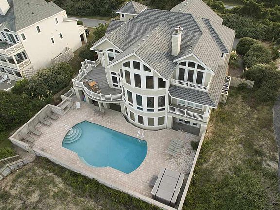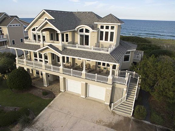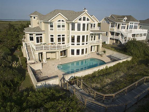 This beautiful "Ambrosia" Floor Plan is being offered for the first time ever. This home was custom built by the current owner and it has never been rented. 7100 sq. feet of pure elegance and views. Situated on one of the most private strips of ocean front property on the Currituck OBX promises uncrowded beaches and views of the ocean and sound that go on forever. This home has 6 bedrooms all with private bathrooms. Home office, beautiful open kitchen with commercial style GE Gas range, 2 wall convection ovens, microwave, ice maker, lg side by side refrigerator with ice maker and two sink/prep areas with center island. Beautiful cabinetry, eat in kitchen area and lots of bar space for gathering in the kitchen. There is a home office, home gym, media/den (could become home theatre) and large game room with pool table, bar and partial kitchen to service game room and pool life. Includes ice maker, full size side by side refrigerator, and dishwasher and microwave/convection oven. Ground floor also includes full bath with direct access from pool area and laundry room with two lg GE washers and dryers. This home is loaded with stunning architectural features from the two story stone fireplace mantle in the main living area to the two story barrel ceiling foyer with beautiful chandelier, a 2 story east wall of glass to offer a stunning ocean view from all over the 2nd and 3rd floor, spacious 2nd floor balcony with trayed ceiling overlooks the 2 story foyer and living area and offers 360 degree views of ocean and sound. Amazing custom oak trim throughout. This home offers a total of 3 gas fireplaces, in ground heated salt pool and hot tub, private board walk and dune top deck on oceanfront and decks galore to relax on while capturing the mornings first light or those stunning OBX sunsets. Two car garage for addition storage and parking. Makes it easy to leave a car for owner use. Security system and intelligent house system makes it easy to manage from afar. Beautifully landscaped with irrigation. Too much to list.....a must see!