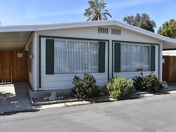 Here's your chance to have your own little piece of golfing paradise in South Palm Springs with Tahquitz Creek golfcourse and San Jacinto mountain views! Enjoy the fabulous view from your patio with golf cart gate access directly onto the fairway. Palm Springs View Estates is a 55+ community with amenities such as clubhouse with fitness center, dining/gaming area, lounging area, laundry facility, pool tables, pool, spa and shuffle board. This particular home is very private with fenced-in carport and covered patio. Back patio faces Tahquitz Creek Golfcourse and the San Jacinto Mountain range with pull down shades for the afternoon sun. You'll have some amazing sunsets sitting on your patio in the early evening hours! The interior is quite spacious with remodeled kitchen and guest bathroom. Large laundry room with a door to the carport. The room off of the kitchen can be used for dining or as a family room. 2 storage sheds and golf cart (needs batteries) are included in the sale along with the appliances and livingroom sectional sofa. Monthly Space rent is $651 and includes water/trash. Hurry up....what are you waiting for? Grab this one and start enjoying the Palm Springs Life!!!!