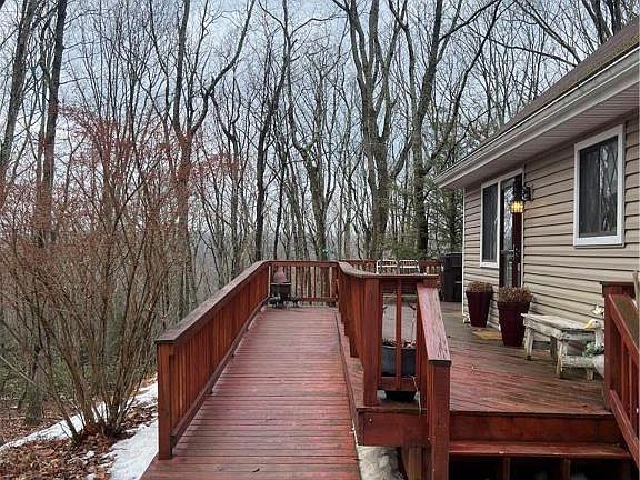 Nestled within a serene cul-de-sac, this enchanting chalet home is set on an expansive 2.13-acre wooded lot, where nature's tranquility envelops the senses. A winding path leads to the entrance, revealing a dwelling that harmonizes modern comfort with rustic charm. All accommodations, thoughtfully situated on the first floor, cater to convenience and ease of living. The inviting living area, adorned with natural light filtering through sliding glass doors, opens to a gourmet kitchen, ideal for culinary endeavors. Adjacent, a dining area creates the perfect ambiance for gatherings with family and friends. Ascend to the second level, where a spacious bedroom awaits, offering a private deck with breathtaking views of the surrounding woodland, an ideal sanctuary for morning reflections or evening star-gazing. The essence of serene living awaits in this idyllic setting, where the harmony of nature and home converge, making this chalet not just a home but a retreat. Seize the chance to call this enchanting sanctuary your own. Convenient to NY,NJ and PA.