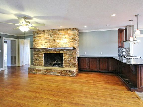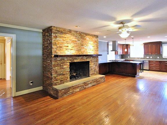 Beautifully updated 4 bedroom, 2 bathroom home on a nice, quiet street in Hillbrook just a short walk to the neighborhood pool & ball field. Home has awesome living space throughout and an incredible outdoor entertaining area. Interior features foyer, living room, dining room, laundry/storage room, family room/den w/ natural gas stone fireplace, and stunning kitchen with custom cabinetry, stainless appliances, granite countertops, & barstool seating. There is an additional huge family room off the kitchen which is ideal for recreation room, kids area, etc. There are 3 nicely sized bedrooms that share a hall bathroom and a master bedroom suite w/ private bathroom. Both bathrooms are fully updated! One of the bedrooms has beautiful wood paneling and is currently used as home office. The outdoor living space is to die for....large deck with covered porch and custom built brick/stone fireplace (w/ natural gas burner) & built in grill! Such a great space for outdoor cooking and entertaining family & friends. The porch & deck area opens into large backyard which is fully fenced-in and has garden & storage building. Really great opportunity with this beautiful home in Hillbrook!