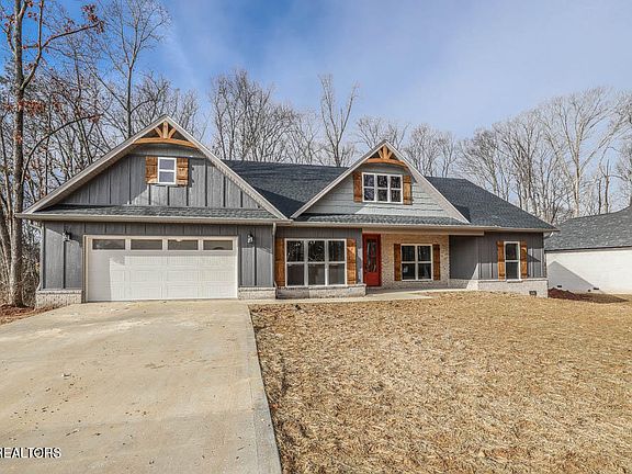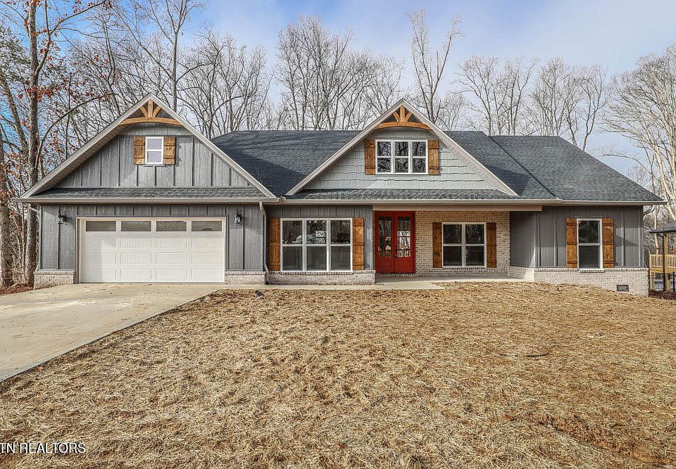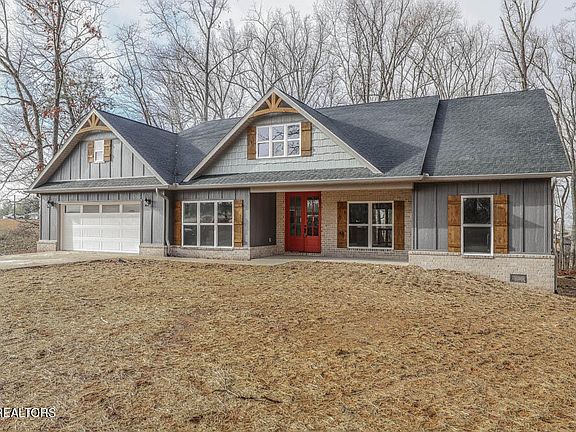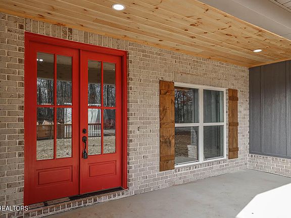 This Conor Cove new construction is a beautiful and spacious rancher with 3 bedrooms plus a designated office, situated on a dead-end street with a wooded and peaceful backdrop. The exterior is made of brick and hardy board, and the front is adorned with red French doors. The front porch and back deck have tongue and groove ceilings, providing a charming touch. Upon entering, you'll be greeted by towering ceilings and a stunning floor to ceiling stone fireplace with a wood beam mantel. The custom built-ins with granite provide a beautiful frame for the fireplace. The kitchen and dining area are an open concept and feature custom tile backsplash, under cabinet lighting, granite countertops, stainless steel appliances, an island with a breakfast bar, and white shaker cabinetry with custom hardware. Added bonuses include a main level office, drop zone, oversized laundry with sliding barn door, upgraded granite countertops, upgraded shelving and storage closet, thoughtfully designed walk-in pantry, upgraded lighting package throughout and stylish wide plank luxury vinyl. The owner's suite is accented with a coffered ceiling, deck access, separate vanities, marble tile walk-in shower, soaker tub and walk-in closet with upgraded closet system. Guest bedrooms have carpet and the guest bath has a double vanity, tub/shower and linen closet. One year builders warranty to convey at closing! Call today to schedule your private tour!