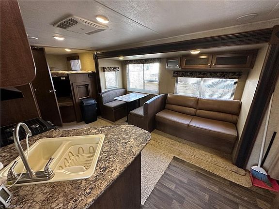 Quaint Lake Getaway – 2017 Hideout Camper permanently set up on a deeded lot. Escape to the perfect weekend retreat in Badin Shores Resort! This 2017 Hideout camper offers a cozy 1-bedroom, a bunk area, sleeper sofa and a dinette that converts for additional sleeping space. Enjoy glamping at its finest while taking in the beautiful water views from the screened porch. Located inside a gated waterfront community, you'll have access to a vibrant, activity-filled neighborhood. The resort features a swimming pool, fishing pier, waterfront boardwalk, boat ramp, basketball courts, putt-putt, workout room, playgrounds, picnic pavilions, and a community clubhouse. Whether you're unwinding by the lake or joining in on community events, this is the perfect place to relax and recharge. Come experience lake life today!