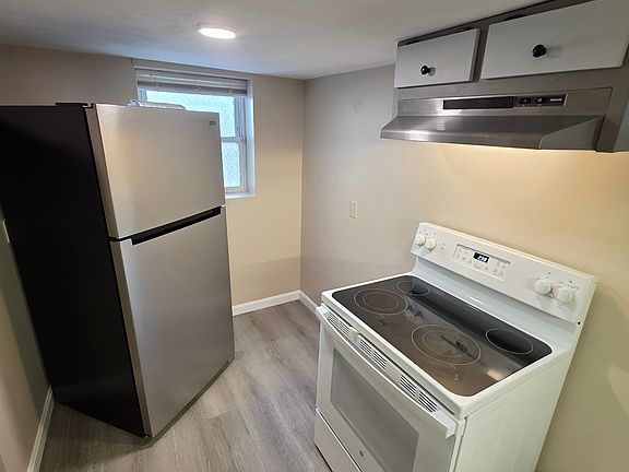 Fresh paintjobLaminate tile flooringBasement level apartmentNew vinyl wood flooringKitchen appliancesSmall kitchenWide-open centralized living-space