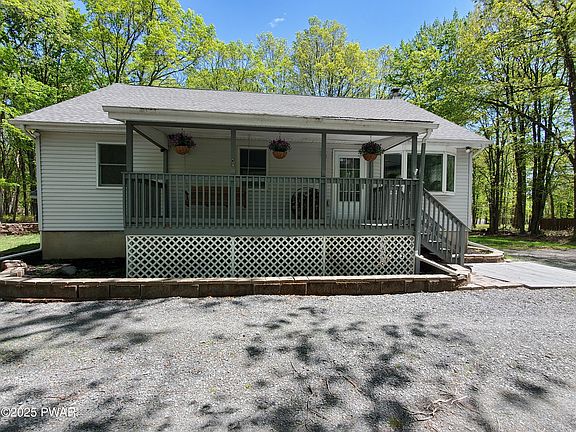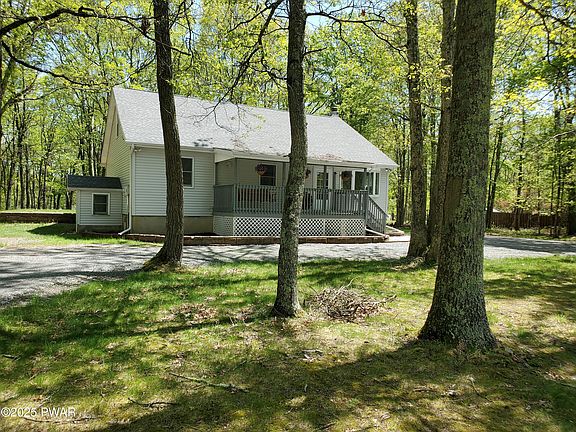 Welcome to FRIENDLY ACRES! Discover the perfect balance of comfort and convenience in this spacious 5 Bedroom and 3 Full Bathroom Cape style home! Nestled on almost 2 level acres with a HUGE (31'x24') heated, vented and cooled garage set just off the circluar driveway and the beautiful front yard. Step inside and you will find gleaming hardwood floors, stone hearth wood-stove, a large kitchen with loads of counter space and a spacious living area complimented by comfortable bedrooms, providing plenty of room for friends and family. Plus the full insulated basement is just waiting to be finished for additional living space. This home is also equipped for efficiency and peace of mind with solar panels and a battery back up system to run primary power in case of an outage. As an added bonus, the home is offered with all major furniture as well as dishes, glassware, cookware, etc. making this a truly move-in ready opportunity. Friendly Acres offers a private setting with a pond, beach & picnic area and also direct access to PA state forest, but is only 10 minutes away from Lake Wallenpaupack and the hamlet of Hawley. Come take a look today and you can be in your ''new home'' or ''home away from home'' by the Summer!