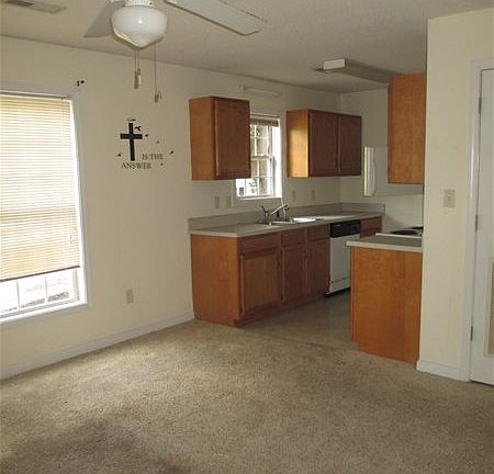 Lower level unit. One bedroom with walk in closet. Kitchen open to living room. Carpet flooring. Stove, fridge, and dishwasher provided. Washer/dryer hook up. Central heating and air. All electric.