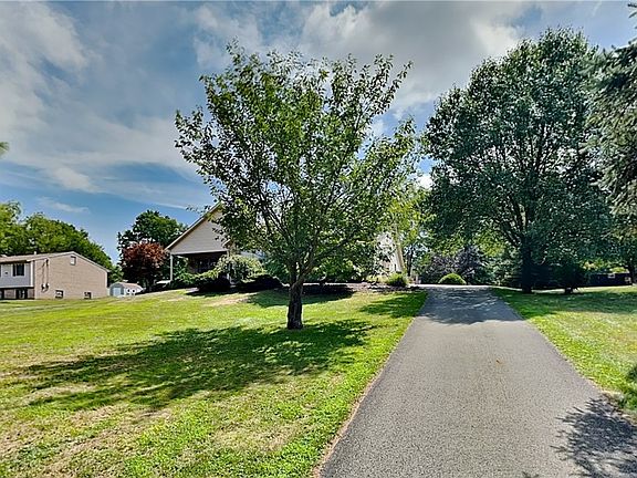 Great opportunity for single level living on a beautiful .6 acre home site. Entry is flanked by a bdrm and den/bdrm served by a hall bath. Main living area is open and bright w high ceilings and 3/4"oak hw. Spacious kit w both a center island and breakfast bar. There's also a cozy seating area, exceptional counter/storage space, and a hall pantry. Dining rm w chandelier. Living rm offers a log burning fireplace and access to the covered rear porch and brick patio. Primary bdrm features a large walk-in closet along w private bath w dual bowl vanity and shower. Laundry/mud room inc laundry tub, large storage closet, and staircase to the lower level. Expansive ll includes a finished full bath and an abundance of space that could be finished in the future if desired. Wide staircase and bulkhead doors provide access to the side yard. Level rear yard with mature trees, storage shed. All appliances are electric. Public water and sewer. Updated HVAC, hot water heater, and garage door opener.