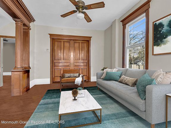 Classic Victorian in the heart of Wrightstown, this 5 bedroom, 3 bath home offers plenty of charm. 1st floor offers wood floors, spacious family room, formal dining room, living room, custom woodwork including solid wood doors, and molding. Kitchen offers newer cabinets, stainless steel appliances, and island. 5 large bedrooms w/ 4 on the 2nd floor, full bath w/Jacuzzi tub, 3rd floor offers opportunity for guest suite. Exterior features 22x32 Pole barn, detached 1 car garage, and concrete inground pool. Great location close to local shopping and base.