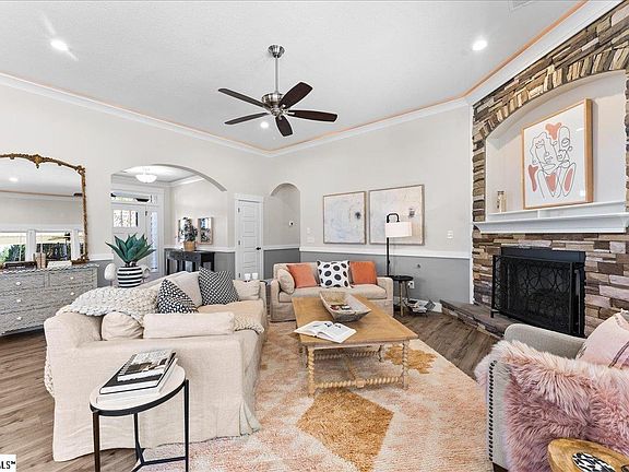 Drayton Elite plan - currently the model home for Pointe Summit. Builder says to sell it! Home has right approximately 2300 Sf of heated space. Stone paver steps welcome you onto the front porch and into the front doorway. In the foyer, you will find a powder room to your right and multiple closets for jackets, etc. Here you will walk into the open living space with 11' ceilings that have lots of crown molding and rope lighting. A corner, stone fireplace and hearth are a key focal point along with lots of windows for natural light. From the living room, you can see the large dining area, kitchen island and "L" shaped, peninsula island that wraps around the sink/exterior wall of the kitchen. Kitchen has a gas cooktop, built in microwave and SS dishwasher. All bedrooms are on the main level. Each is spacious and the primary suite features two, large closets and tray ceilings above the bed. The primary bath has double vanities, 5' tiled shower with corner seat and a soaker tub. The back porch has a wood burning fireplace and open to the patio. A privacy fence along with back property line can be added on to with ease. Come see this beautiful and open plan today!