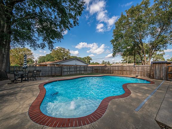 Sparkling swimming poolInviting poolFormal dining roomWarm touches throughoutCorner lotFenced backyardThoughtful built-ins