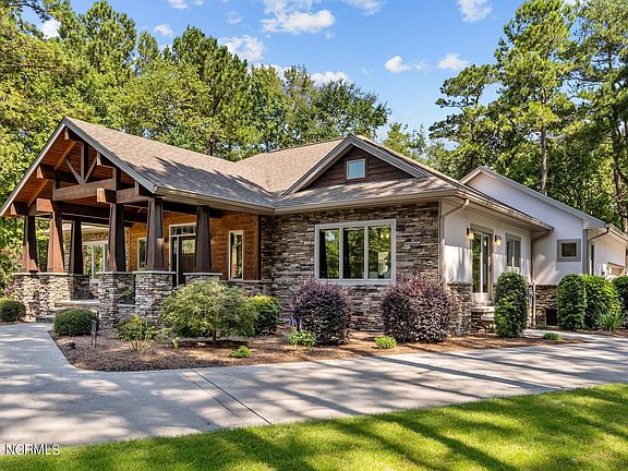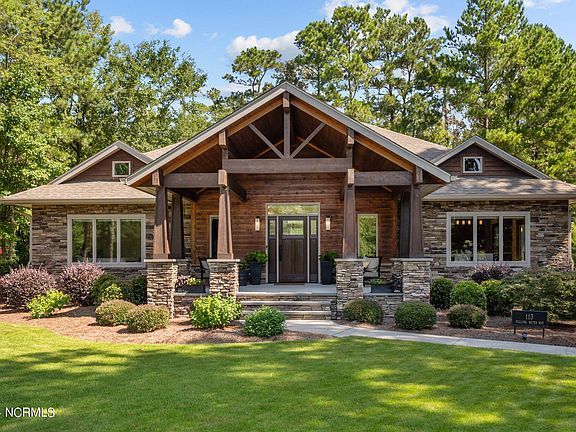 Discover serene living at its finest with this custom-built Frank Lloyd Wright inspired home in the prestigious River Bend neighborhood. Sited on a quiet cul-de-sac, this 3-bedroom, 2.5-bathroom masterpiece spans 2,728 sq ft, promising comfort and elegance. The striking front porch, adorned with wood beams, introduces an abode where natural elements and architectural genius converge. Inside, you'll find hardwood flooring throughout the living areas, carpeted bedrooms, and a vaulted ceiling in the living room enhancing the airy feel. A stone gas fireplace adds a cozy touch.Effortlessly entertain in the spacious kitchen featuring deep walnut custom cabinetry, Samsung appliances, gas range, a 6-foot island, and stylish pendant lighting, all flowing seamlessly into the dining room. Retreat to the expansive 23x14 master suite with a trey ceiling, an en-suite bath boasting dual vanities, walk-in tile shower with multiple showerheads, bench seating, and a cedar-lined walk-in closet. Each guest room boasts ample space and excellent closet capacity.Enhance your lifestyle with doors that open from the living room to an exquisite covered porch, designed for alfresco enjoyment amidst Belguard stone patio and lush landscaping. The estate area of River Bend offers an enviable lifestyle with a multi-million dollar clubhouse, restaurants, a golf course, pools, tennis courts, and more, just 45 minutes from Wilmington, NC. Embrace luxury and privacy in this standout property, designed for those who aspire to both tranquility and community connection.