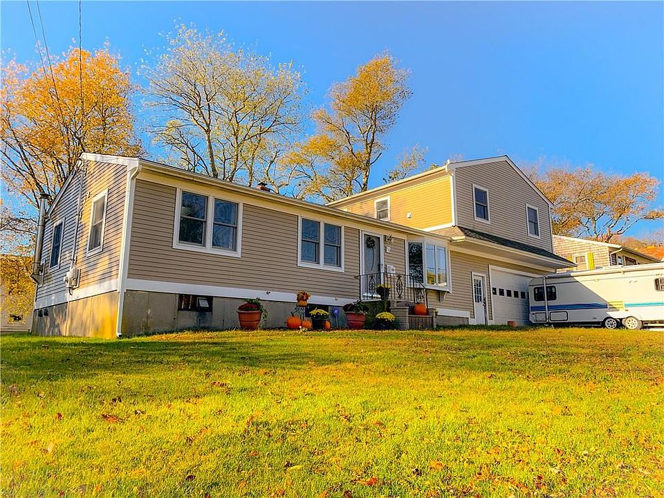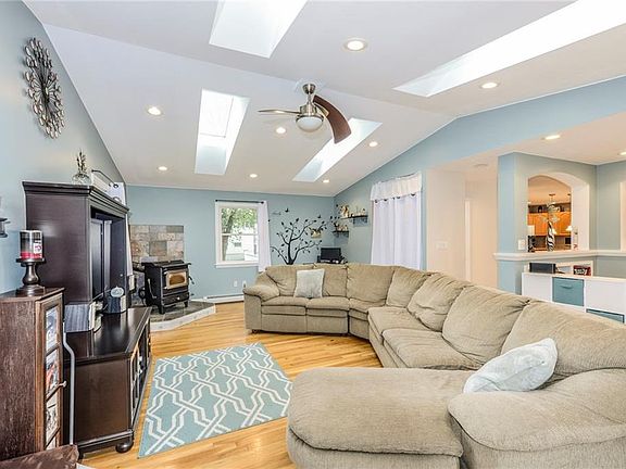 Tucked back at the end of the street, this lovingly maintained and light filled home features an open style floor plan with a large eat-in kitchen, dining room, and full bath finished with a gracious 23x16 living room with wood stove. The second floor features two bedrooms with a full-shared bath and the master suite with bath. Skylights throughout bathe the home in natural light even on cloudy days. Storage abounds in the full basement and the attached garage. An adjoining deck is accessible via a sliding glass door off the kitchen that leads to the back yard. Updates include a new roof in 2009, Buederas forced hot water heating system with eight zones installed in 2013, indirect hot water, and 200 AMP electrical panel, septic, and tie in to public water. All this conveniently located to schools, Tom's Market, Classic Pizza and highway access, make this home definitely not a drive by.