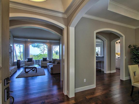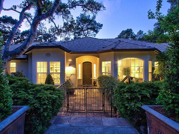 Beyond the gates of this prestigious community in the coveted area of Jack's Peak in Monterey. Perched atop Flagg Hill on 1.27ac, this sprawling custom residence boasts panoramic views of city & ocean. Exquisite living across nearly 5000sqft featuring 5 beds, 4.5 baths, Study, wine cellar, + more. Recently renovated throughout w/ custom design elements & fine finishes with hand scraped wood floors, LED lighting,19th century barn wood mantles, custom tile work, crown moldings & archways, + more. New gourmet chef's kitchen w/ custom soft close cabinetry topped with Carrera Marble, Thermador appliances, wine chiller, island with sink, built-in features & large walk-in pantry. Downstairs level boasts an entertaining area w/ fireplace, wet bar with custom cabinetry, fridge, wine chiller, & access to 2 outdoor patios. The lower level also has a great guest wing and en suite bedrooms with separate access. A car lovers dream with an expansive 4-car garage with storage and cabinetry.