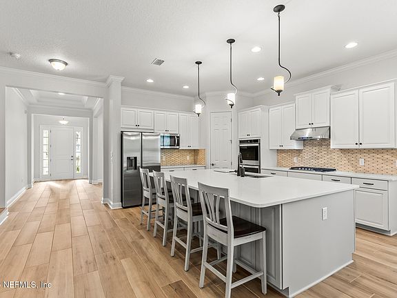 Retreat to unparalleled luxury in this stunning 5-bedroom, 4-bathroom estate, nestled within the prestigious Rivertown community. Crafted for the refined homeowner, this exquisite residence features a graceful open layout, a chic formal dining area, a secluded office, a flexible loft space, an ensuite bedroom, and a roomy 3-car garage. Meticulously curated with high-end designer finishes, this home exudes elegance at every turn. Highlights include sleek white cabinetry, extended wood-look tile flooring, custom built-in cabinetry, quartz countertops, and fresh interior paint. The gourmet kitchen is a chef's dream, featuring stainless steel appliances, double ovens, a gas cooktop, and an expansive island with seating perfect for culinary creations and seamless entertaining. Beyond the sliding glass doors, an expansive lanai awaits, offering a tranquil retreat to enjoy the privacy of your fenced yard and the scenic natural surroundings. The lavish primary suite is a sanctuary unto itself, featuring a serene sitting area, walk-in closets, and a spa-inspired en-suite bath, creating the ultimate space for relaxation and indulgence. Located in St. Johns County, Rivertown is renowned for its top-rated schools and convenient access to everything you need. Community amenities include a clubhouse, swimming pool, tennis courts, playgrounds, an exercise room, and much more. Don't miss the opportunity to make this beautiful home yours! Welcome home!