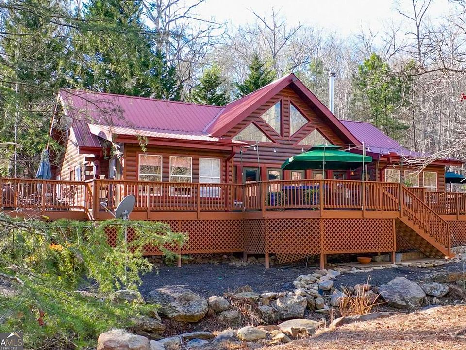Welcome home to the amazing community of Lake Arrowhead. Nestled in the Foothills of the North Georgia mountains this Private Gated Community with a 540 Acre lake offers a wonderful lifestyle. This Beautiful Log Cabin home on over 1.6 Acres on cul de sac. 3 bedrooms, 2 full baths, and stunning views all around! Enter the home to find an open concept Great room and stunning kitchen. The Great room boasts beautiful beamed cathedral ceilings, loads of natural light from the fantastic windows, and a clawfoot wood burning fireplace. The kitchen features stainless steel appliances including a double oven, a gorgeous center Island with seating, updated lighting, stunning cabinets, vaulted ceilings with wood beams and a rustic stone accent wall. Attention to detail at every turn. Adjacent to the kitchen is a charming dining space with view into the family room. All bedrooms are spacious, feature continued high beamed ceilings and rustic finishes, and are located on the main floor making this a true ranch home for your convenience. The first guest room is large, has a walk In closet, and an adjoining flex space that is perfect for a craft area, study, or reading nook. The second bedroom is equally spacious and shares the full bath in hall with the other guest room. This guest bath offers a beautiful wooden vanity and mirror along with a shower/tub combo. Continue on to your oversized master suite where you will find a large living space, walk in closet, adjoined flex space, and en suite private bath. The adjoining flex room could be used for storage or a private sitting area. The master bath features a double vanity, stone encased soaking tub, and separate shower. You will enjoy this private lot, sitting on nearly +/- 1.63 acres with a beautiful treelined view and 3 streams. The wrap around porch offers multiple vantage points to enjoy the views, unwind, and entertain. There is also a separate oversized 2 car garage with covered carports on either side. This home offers so much charm, comfort, and privacy! This property is within a spectacular community that is truly one of a kind. Lake Arrowhead amenities include championship golf course, lake, marina, clubhouse with restaurant, miles of hiking trails, 2 pools, tennis courts, Pickle Ball and so much more!