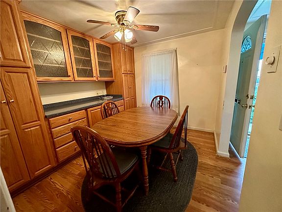 This 3 bedroom home has a first floor primary. This addition over the garage allows for a 23x 11 (m/l) room with laundry and baseboard heat/wall AC right off the kitchen. A newer kitchen with all appliances and dining room with built in cabinetry/china closet just off the 15 x 12 living room gives this home a warm, cozy feeling. Lots of natural light throughout the home. An updated full bath with colorful grays/black and white tile give a fun modern feel also on this main level. Upstairs you will find the traditional cape cod bedrooms each with closets. A very large/semi finished basement includes a built in bar area with a small half bath just waiting for some TLC to become the perfect family room. Walk out to the 2 car garage that can be accessed by way of the rear alley. This home is being sold AS IS.