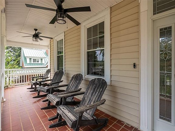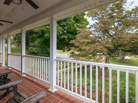 Welcome to the Dan Chatham House built in 1913 on historic Gwyn Ave. Walk 1 block to historic downtown Elkin, farmers market, trails, library, restaurants, shopping, schools. Standing on a terraced front lawn, this Colonial Revival-style home features original molding, trim, 10 ft ceilings. Updates include new white oak hardwood floors, fresh paint, newer windows. Renovated kitchen features new cabinetry, butcher block countertops, farm sink, gas stove, stainless appliances. Main level features living room w/gas fireplace, sitting room, dining room, powder room. 2nd level features primary bedroom w/fireplace, dressing room (could be bedroom, nursery, office), en-suite bath w/new tile as well as washer/dryer, 2 additional bedrooms & bath. 3rd level features spacious 4th bedroom or recreation room, office or studio. Outside enjoy covered front porch, detached 2-story garage apartment ready for renovation, storage building, shared drive w/ample parking.