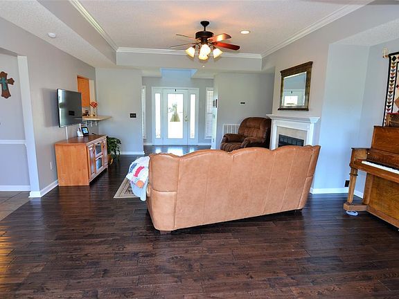 - LIVING ROOM DESC: Fireplace, Crown Mold, Wood Floor, Ceiling Fan, Recessed Lighting, Coffered Ceiling