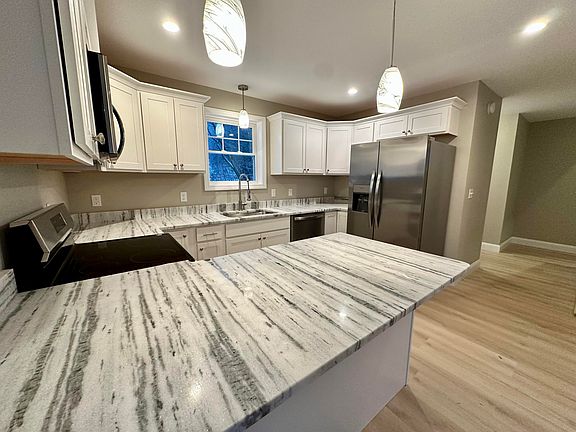 Right between Thompson and Pleasant Lake, this home offers a great, quiet setting. With Bright finishes you'll find LVP flooring, granite countertops, and stainless steel appliances. Other features are a front Deck set high in the tree, first floor laundry closet set up for a stackable washer and dryer, and plenty of space to expand in the basement with plenty of light and walk out double doors.