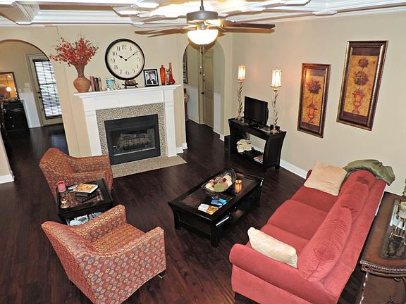 Former Model Home w/an Abundance of detail throughout.Open floorplan features custom coffered ceilings,5" handscraped hardwood floors throughout main living areas,double sided fireplace w/tile surround,crown moulding,recessed lighting,wired for surround sound,tankless water heater,&mudd bench.Kitchen features custom cabinets,granite,glass tile backsplash,double ovens,& recessed lighting.Large secluded master suite w/double trey ceiling,recessed lighting,&hardwood floors.Master Bath w/double vanity,heated tile floors,tile shower,whirlpool tub w/tile surround,&rope lighting.Located on corner lot