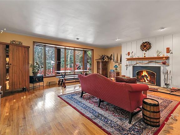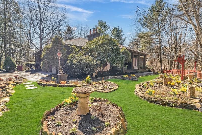 Hidden Sanctuary in Center Twp. It's that needle in the haystack. Located on a cul-de-sac nestled in, and surrounded by trees and wildlife. From the moment you enter the driveway you will be enraptured by the absolute beauty of this unique ranch home. If peace and solitude is what you seek, this will meet every expectation. From the rocking chair front porch to the back patio overlooking the wooded yard. Step out of your master suite onto the private deck to overlook the koi pond and bird sanctuary. So many amazing features to the home include the huge eat in kitchen with island, pantry, corian countertops and all wood cabinetry. Huge living room with gorgeous bow window area. Back sunporch surrounded by windows. Finished basement with half bath, 4th bedroom with walk in closet, enormous laundry area and storage room. Master suite with large walk in closet and separate bath areas with tons of natural light.This home will not disappoint the discerning eye. Take your time and ENJOY!