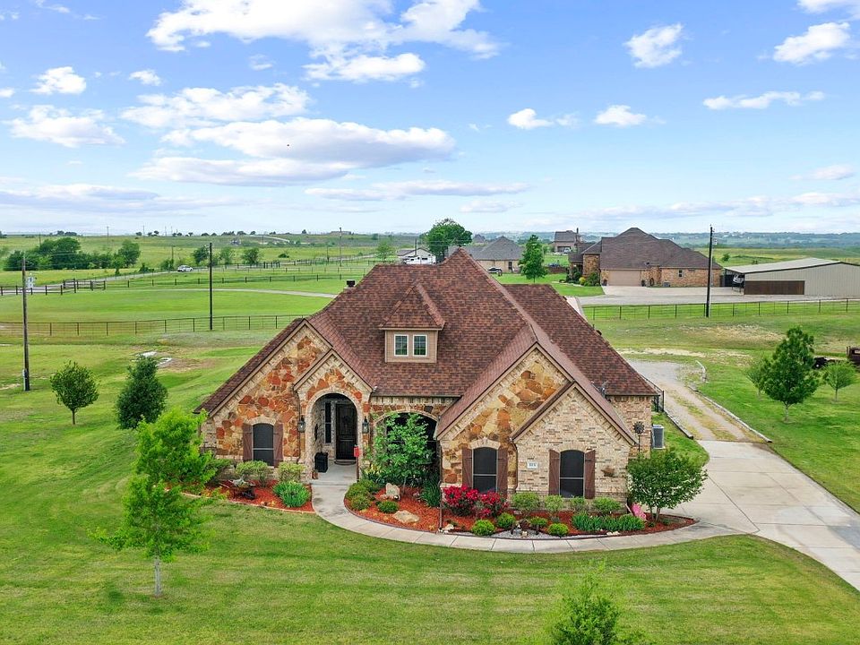 Stunning Bailee custom brick & stone in sought after Montecito Estates. Home is ultra energy efficient w Nation's Pure home filtration & softener system, is fully spray foam encapsulated & has solar screens all around. It features crown mouldings, granite throughout, hand scraped hardwoods, vaulted & beamed living room, kitchen w island, custom wood cabinetry, bar seating, stone kick wall, double ovens & decorative archway over 5 burner cooktop & soaring rock fireplace wall. Oversized primary suite w 12 ft ceilings & en suite bath w granite, 2 sinks, soaking tub, separate shower & lg closet. Sunroom overlooks back yard & dog proof fence, too. For toys & projects an insulated 30x40 shop w electricity w 14 ft sidewalls w 16 ft auto roll up door on one end & an 8 ft door on the other. There is also an 8x20 enclosed area off the front w an 8 ft roll up door to store lawn equipment. Tornado shelter in garage conveys. This home is move in ready and luxe. No HOA.
