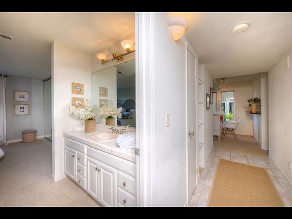 Bright single level end unit with water views. This east facing end unit features an open floor plan, a large living room with a gas fireplace, sliding door and deck. Covered parking, storage,community pool, close to downtown Sausalito. Open House Sunday 27, 2-3pm