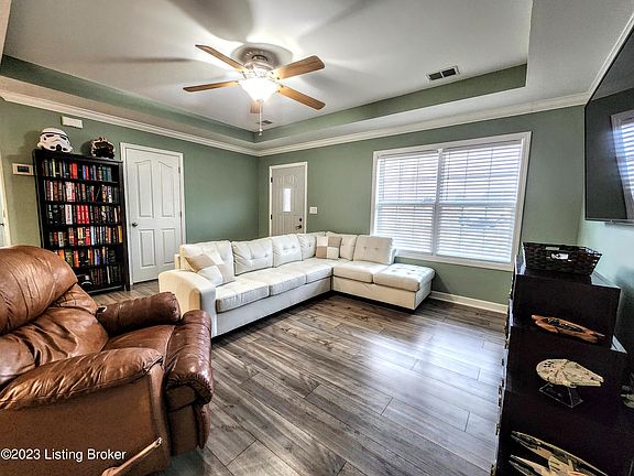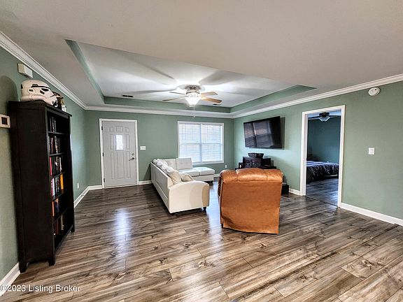 Come tour this spacious ranch in quaint Vine Grove! This well maintained home features 3 bedrooms, 2 full baths, large living room with trey ceiling, eat-in-kitchen, nice size master with two walk-in-closets, double vanity in master bath, all new paint and new flooring throughout home, newer heating, air, water heater, covered front porch, patio, 2 car garage, all on a nice lot and just minutes to schools, shopping, dining and Fort Knox! Take a tour of this beautiful home today.