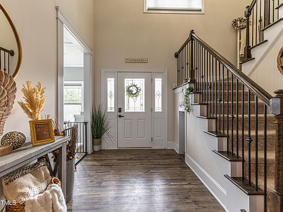 Welcome Home! This move in ready 5 bedroom well taken care of home is waiting for you. If you are looking for a spacious stunning home in the highly desirable neighborhood of Knolls at the Neuse , this one is definitely worth the preview. With the slightly hilly terrain, and beautiful trees , it feels like you are in the mountains. Be prepared to be impressed the minute you walk inside. The quality and detail of this home is definitely a wow factor. Built in 2020 and sitting on .53 acre in a quiet culdesac in the rear of the neighborhood , the rocking chair front porch , the lovely style of this home and the beautiful stone accents create an exceptional curb appeal.As soon as you walk inside you will notice the open sunny floor plan and the cutest doggie gate that leads to a cozy space under the stairs for your furry family members. You will notice the upgraded trim package right away. The kitchen offers stainless appliances and a huge granite island that flows into the roomy breakfast nook. This area over looks a family room with a beautiful stone gas fireplace to warm you in the cooler months. The room on the right as soon as you walk inside can either be a formal dining room, or an office. The first floor has hardwood throughout including recently installed in the owners suite. The master bath includes an ensuite bath with walk in tiled spa shower and double vanity. The 4 bedrooms upstairs are very spacious and the attic space can easily be finished for more square footage The serene wooded view is breathtaking from the breakfast nook and upstairs. .When you go out back the rear screen porch and deck extends living to the outdoors. Enjoy watching wild life such as deer , many varieties of birds , rabbits , etc. There you will find a 6x14 enclosed patio porch to use all year long, and a 10x14 covered deck. The fenced in yard has a gate that opens to allow access to the Neuse River . The HOA is only 160 per year. This home is centrally located near Shops and Restaurants , and there are memberships available for pool and tennis, pickleball and a gym at the nearby club in the neighborhood which is within walking distance. There are elementary schools less than 3 miles away and many other schools that are nearby. Schedule your preview today, this beauty will not last.