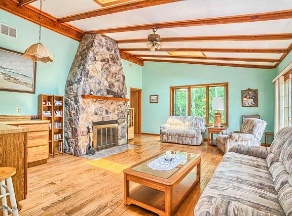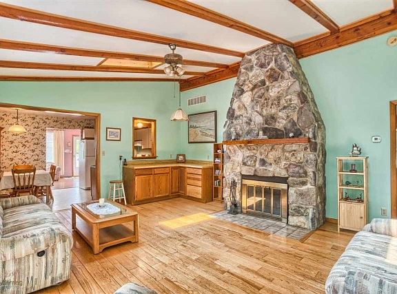 You will be pleasantly surprised when you see this home! Not your typical ...expanded 3 bedroom 2 bath, with approximately 1500 sq. ft. of living space. This home features bright and sunny Living Room, Kitchen with dining area and all major appliances are included. Utility Room with washer, dryer, water heater and access door to garage and back yard. There is a spacious Family Room with floor to ceiling stone fireplace, cathedral ceiling with skylights, wood planked floor ... this room offers lots of sunlight with the windows and slider. Slider leads to large deck with gas BBQ. Master Suite has hardwood floors, huge closet and private entry to full bath. Low maintenance front yard with stone. Nature lovers will enjoy the private treed back yard with and stream.... All you see is Mother Nature. The sideyard has vegetable gardens. The crawl space has a 5 x 30' +-storage/workshop area with wood floor and electric. City water, city sewer, gas heat, central air .... so much more! Easy to see !
