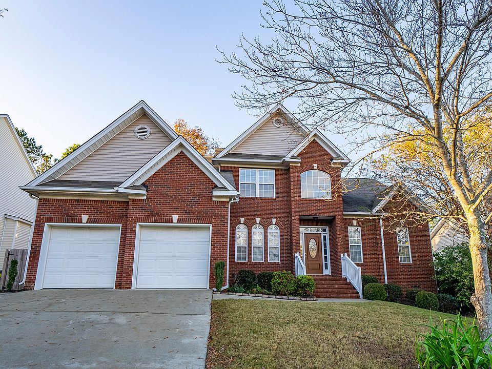 Beautiful Two-Story Home in The Mill Subdivision. This stunning two-story brick and vinyl home features 5 spacious bedrooms and 2.5 bathrooms. The primary bedroom, located on the main level, boasts all-new carpet and fresh paint. Its en-suite bathroom offers a luxurious walk-in shower, a relaxing garden tub, a separate water closet, and ample space for comfort. Hardwood floors run throughout the main common areas, including the formal dining room adorned with elegant wainscoting. The living room features a wall of windows overlooking the private wooded backyard and is enhanced by a cozy gas log fireplace and an open ceiling to the second floor. The eat-in kitchen is perfect for both casual and formal meals, offering a large walk-in pantry, an island, a brand-new range, dishwasher, and microwave. A new Nest thermostat provides modern comfort and efficiency throughout the home. New carpet extends to the upstairs common areas and living room, adding warmth and style. Step outside to enjoy the amazing covered back porch and expansive patio, ideal for entertaining or relaxing. The fully fenced backyard includes extra cement parking space and room for a golf cart. The home also features a large laundry room and a two-car garage for added convenience. Located in the desirable neighborhood of The Mill, this home is just steps away from fantastic community amenities, including a clubhouse, pool, and playground - perfect for families and social gatherings. This property is truly a must-see