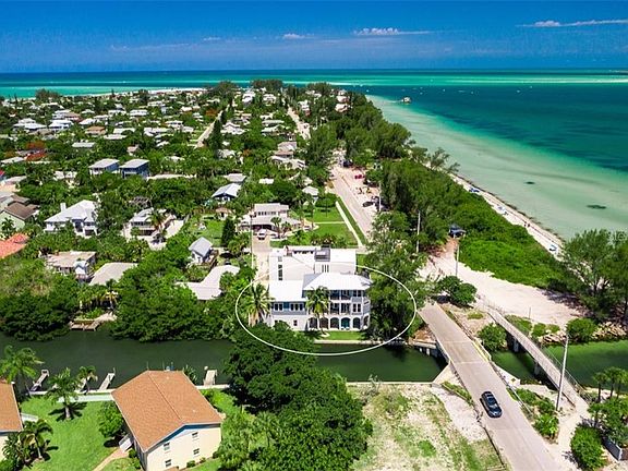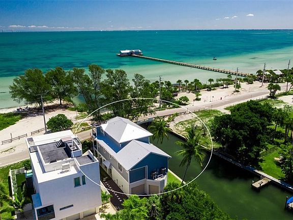 Rarely available, waterfront estate on Anna Maria Island! Located on the canal with 110 ft of concrete seawall, this 2018 coastal contemporary home offers panoramic water views of the open bay and beach from virtually every room!! Plans for 10,000 lb boat lift have already been quoted and permits obtained! This home is situated on one of Anna Maria's most desirable lots offering a luxurious, waterfront lifestyle with the beach and newly renovated AMI Pier directly across the street, just steps from your front door! Elevated and custom built, this home boasts three spacious bedrooms, a DEN, two and half baths, a gourmet kitchen, private elevator and a large laundry room equipped with a utility sink, pantry, and counter top for folding. A great room floor plan complimented by a large balcony overlooking the water creates a perfect space for entertaining guests. Enjoy spectacular water views from the kitchen which features marble countertops, a large center island, custom cabinetry, top of the line gas range, and stainless steel appliances. This dream beach home offers a true in-door/out-door lifestyle with multiple balcony spaces on every level including a roof top sun deck accessible from your master suite offering endless views of the aqua blue waters of Anna Maria. Wake up in your master suite to breathtaking, floor to ceiling views of the bay. Custom blinds with remote controls have been added to every window in the suite. Large walk in closets with built-in shelving is a desirable feature. The master bathroom offers custom tile design and boasts dual sinks, marble countertops, a large soaking tub and a separate walk-in shower. This luxurious beach house also offers a covered, heated saltwater pool and spa overlooking the canal. Other well appointed features include crown molding, central vacuum, exceptionally detailed wood vaulted and tray ceilings throughout, dual zoned 30 seer AC upstairs and down, and the home is pre-wired and set up for a whole house generator. This home is being sold fully furnished. Move right in and start living the island life! Anna Maria Island vacation rental company has stated that this house would generate $150,000 plus in rent annually!