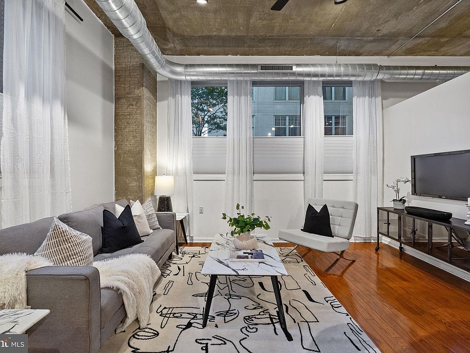 Welcome to The National Unit 3D1, a pristine residence within a gated community nestled in historic Old City. This spacious corner two bedroom, two bathroom residence with deeded on-site GARAGE PARKING offers more than 1,100 square feet of sophisticated living space. The open living and dining areas feature soaring ten-foot ceilings and oversized windows that flood the interior with an abundance of light. The kitchen is equipped with upgraded Whirlpool appliances, granite countertops, and sleek cabinetry. Both bedrooms are generously proportioned and offer ample closet space. The primary bathroom boasts a double vanity, ceramic tiles, and designer finishes. Privacy window film throughout allows abundant light while maintaining discretion. With gleaming hardwood floors, smart upgrades, and thoughtful design, this residence blends luxury, comfort, and convenience. Residents enjoy a landscaped shared courtyard and the ease of indoor garage parking. This pet-friendly home is steps from fine dining, world-class shopping, renowned cultural institutions, and vibrant nightlife. Convenient to UPenn, Jefferson and Drexel campuses, HUP, CHOP, and all major public transit lines.