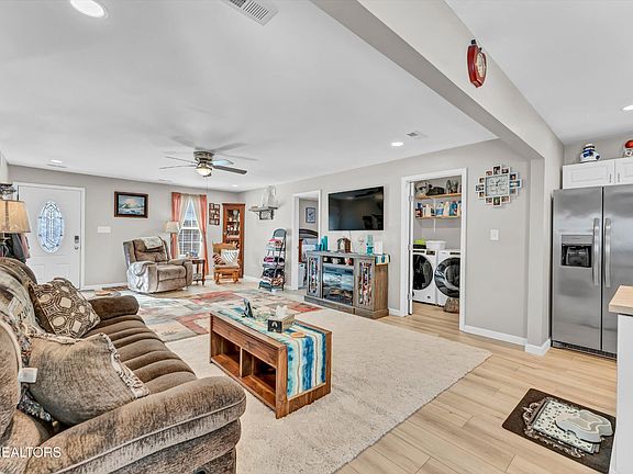 Bright and beautifully updated, this 3-bedroom, 2-bath, all one-level home in Oak Ridge offers a seamless open floor plan and stunning light-toned LVP flooring throughout. The spacious living room flows effortlessly into a modern kitchen featuring stainless steel appliances, crisp white cabinetry, and a butcher block island. A large dining area bathed in natural light from French doors opens to the outdoors, perfect for entertaining. The primary bedroom boasts an ensuite bathroom with a walk-in shower and double vanity. Additional highlights include a convenient laundry room, a brand-new front patio, a fenced yard, and a storage shed in the backyard. Move-in ready and designed for comfortable living, this home is a must-see!
