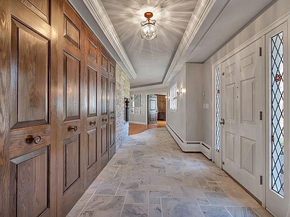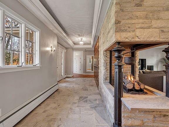 This exceptional property, Woodcrest, offers privacy, warmth and comfort set on 5.27 enclosed wooden acres. A beautiful entrance hall floored in marble leads to the generous open living room and formal dining area with a three sided quartz fireplace. The french doors in the living room open to a granite patio with pergola - perfect for outdoor entertaining or enjoying the serenity. The spacious library/den is highlighted with rich oak paneling, a fieldstone fireplace and a built-in dry bar. The home also features a true gourmet kitchen, well-appointed with; custom cherry cabinets, a large center island with a breakfast bar, granite countertops, a Subzero refrigerator, double Thermador ovens, a five burner gas cooktop, a built-in microwave draw and a breakfast nook with a gas fireplace. Additionally there are two first floor master suites with lavish en suite bathrooms. A third bedroom suite is located on the second floor and a mud room/laundry room and large pantry is just off the kitchen as is the screened in porch. Some of the other amenities this home has to offer include; wood floors throughout, central air, exquisite crown moldings, an over sized three car garage and a total of four full baths and one half bath. Just minutes to the shoreline, airport, area casinos and attractions. Midway between New York City and Boston. Casual, livable and timeless.