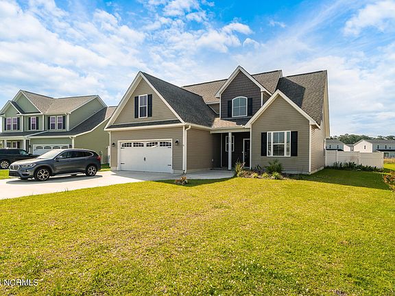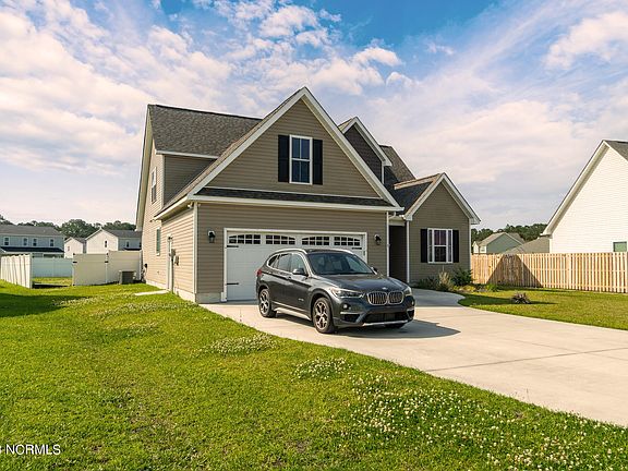 YOU GOT THE FAMILY—WE GOT THE PERFECT HOUSE! What could be better than living 7 miles from the pristine Emerald Isle beach without paying the ''beach price'' for your home? This two-year-young home is nestled on a 0.39-acre lot in Coldwater Creek, a quiet community comprised of fine homes. You can reach Emerald Isle, Cedar Point, Cape Carteret, and Historic Swansboro in a few minutes from this address. This property affords quick access to many events/festivals, restaurants, marinas, boat ramps, fishing piers, recreational facilities, retail stores, Camp Lejeune and Cherry Point military bases, the area's best golf courses, and many coastal attractions! This home features a free-flowing floor plan of space and function, 3 bedrooms, 2.5 bathrooms, a bonus room, a spacious laundry room, 2 car garage, light and airy wall colors, and large windows with lots of natural light throughout the home. Enjoy cooking in this large open kitchen with excellent finishes, such as sequoia granite tops, shaker-style white cabinets, stainless steel appliances, a pantry, plenty of counter space, a bar, and a breakfast nook. A formal dining room provides ample space for large family gatherings. The inviting living room has a gas log fireplace to keep you warm on cold winter nights. Luxury vinyl plank floors throughout the entire main floor and carpet in the bedrooms and bonus room upstairs. The primary bedroom on the main floor is separated for maximum privacy. It features a large bathroom with a walk-in shower, a soaking tub, and a walk-in closet. The backyard is fenced with a 6-foot white vinyl privacy fence, perfect for your family and pets, and a covered patio for entertaining. The home is in the award-winning Carteret County school district. Enjoy this premium location with no city taxes, flood insurance, or HOA dues. Qualified Buyers may be able to assume the Seller's current VA Loan at 3.625%. Call us today for more info and to schedule your showing. BE FIRST IN LINE, OR BE SORRY!