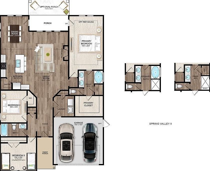The Spring Valley II by Landmark24 Homes: efficient living at its best! One look at this ranch style 3-bedroom 2 bath home and you will agree. As you step in, the bright, airy great room welcomes you with its cathedral ceiling and open design. Entertaining is easy. Guests can stroll from the great room out to the covered patio area. This smartly designed kitchen connects to a large breakfast room and has ample countertop space, stainless steel appliances and 42-inch cabinets and granite countertops. The common areas come with modern wood look Vinyl Plank Click Plus flooring and carpet in the bedrooms. Not to be overlooked, this split floor plan ensures the primary suite its privacy and offers two perfectly sized bedrooms. With double vanities in the primary bath, a finished two-car garage and fully sodded yard with irrigation, this is a must-see on your dream home shortlist! All builder incentives applied.