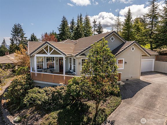 Unobstructed panoramic views from this Bell Hill single story stunner. Views of the Strait, San Juans, Victoria, Protection Island, Sequim, and the North Cascades! Primary has a barn door closet and a bathroom with an ADA compliant shower and wide entry. Oversized guest suite with a private patio has been used as a lively craft room with excellent light. Third bedroom makes for a dreamy office with a private deck to enjoy those views! Hickory floors throughout the spacious great room and kitchen and a new tankless water heater are a few of the upgrades of this beautifully maintained home. Low-maintenance yard and roomy yet manageable square footage all makes for a stress-free home. The views don't get any better!