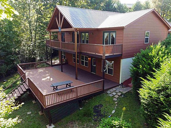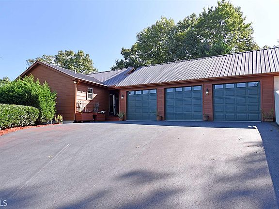 Marvelous Mountain Chalet! 3 CAR GARAGE!!! 4BR/3BA w/ Cathedral Great Room, wood and sheetrock mix. Split plan with 2/2 on main floor. Master suite with Tiled oversized shower. Lots of glass and wonderful views. Hardwood floors on main floor. Large rooms, Large covered porch and HUGE OPEN Party Deck on Lower level. Daylight Basement level offers and INCREDIBLE Bar/ wet bar, 2 more rooms, Game Room, full bath, and utility room.2 gas log fplcs, Zoned HVAC w/ 2 thermostats. Poured Patio on main floor, Lots of entertaining space. Really a fabulous Home. Metal Roof. Southern Blairsville Location.
