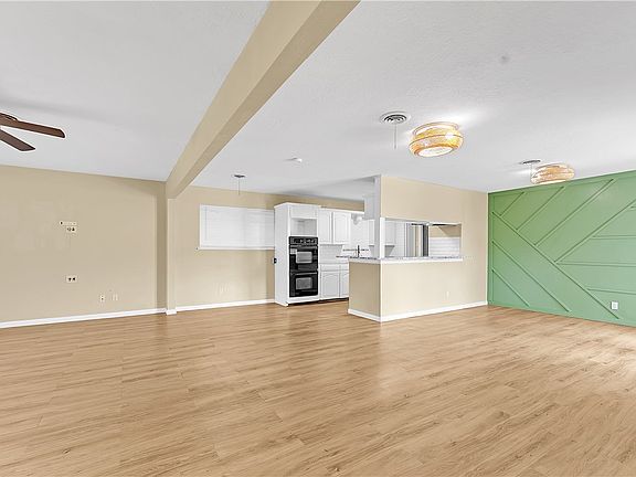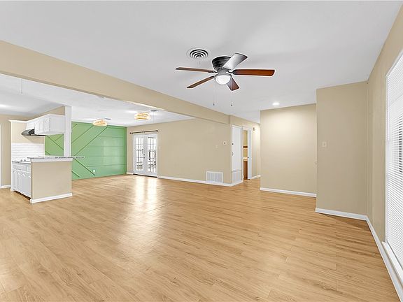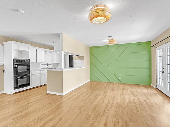 Inside, the open layout creates a warm, inviting atmosphere. The updated kitchen boasts painted cabinetry, modern hardware, sleek granite countertops, and subway tile backsplash, all perfectly balanced by durable wood-look LVP flooring. The kitchen flows seamlessly into the spacious living and dining areas, making it the perfect spot for both entertaining and everyday living. The primary suite and additional bedrooms offer comfortable retreats, with natural light and ample closet space. Both bathrooms have been stylishly updated with modern vanities, fresh tile on all walls, and thoughtful design touches that elevate the look and feel of the home. Step into the large dining room and you’ll immediately appreciate the modern accent wall with fresh paint tones, updated fixtures that add personality and charm. With a functional flow from room to room, this home feels much larger than its square footage suggests.