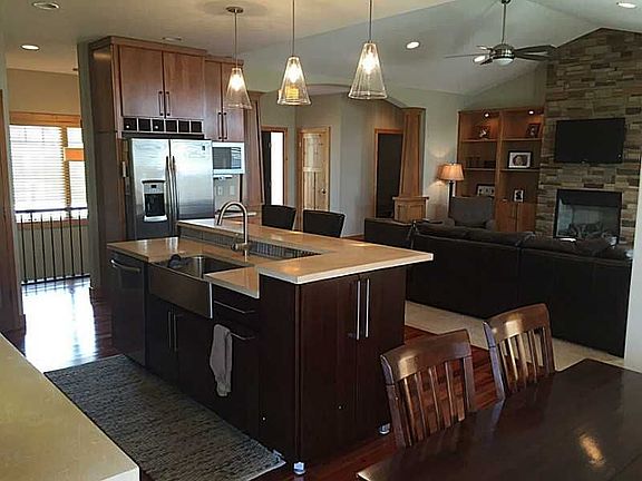 Custom built home, A MUST SEE! Beautiful stone front ranch with decorative concrete driveway. Large master bedroom w/huge walk-in closet. Laundry off the master. Spacious master bath w/large soak tub and decorative concrete shower. Beautifully maintained hardwood floors on a large portion of main floor. 9' ceilings on main and lower level. Great room and kitchen are in a large open floor plan. Stone fireplace with built-in cabinets. Kitchen has stainless appliances, decorative countertops and large pantry. Large lower level rec room w/wet bar. Walk-out lower level into backyard to a built-in fire pit. Deck has a great view. Spacious 3 stall heated garage with drains. 3rd stall is extra deep. Great neighborhood and College Community Schools.
