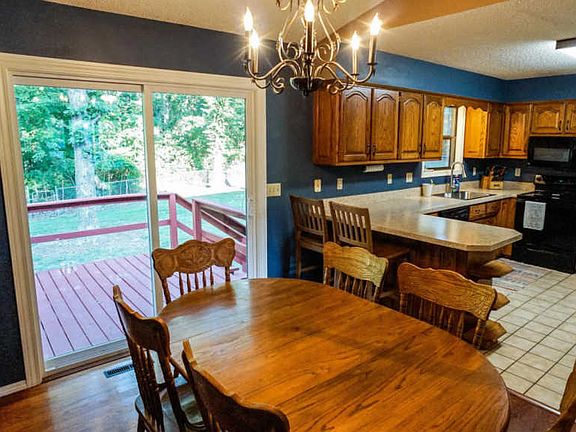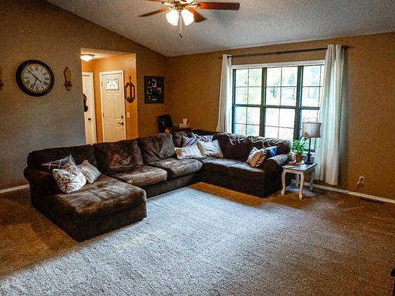 One acre lot with wooded back will give you plenty of room to play, add a workshop or just enjoy the evening on your spacious deck. This well cared for, 4 bedroom home is in Carl Junction school district with private lake nearby and is eligible for 100% RD loans. Recent updates include new roof and HVAC. Living room with vaulted ceiling and eat-in kitchen.