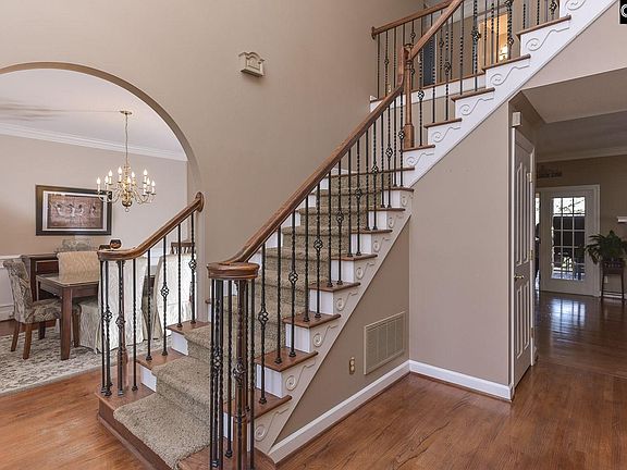 All Brick, 2 story home located on .52 +/- acre and nestled among lots of hardwood trees. As you enter this home, you'll see the high open foyer w/a formal living area (or den; or office; or flex space) on the right and the formal dining room w/wainscotting; chair rail and hardwood floors on the left. Then enter into the kitchen w/tile floors; black appliances, kitchen tiled backsplash under cabinets; wine storage over refrig; a built in kit desk & granite counters. Laundry rm w/cabinets and 1/2 bathroom downstairs. Next is the large family room which has a gas fireplace, hardwood floors and opens out onto a screened porch which oversees the large wooden deck and fenced backyard. Backyard, has a sunken hot tub and large fire pit area to enjoy & relax after a long day. Upstairs are the 4 bedrms; 2 bathrooms. All bathrooms have tiled floors and master bedrm bookcase built-in and closet is really large. Home located in great school district and convenient to interstates, shopping and dining.