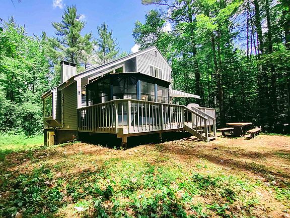 Back on the market with a lower price! Looking for a vacation or second home in Bartlett NH? Here is your 4 season getaway with a private 2.5-acre wooded lot that can be subdivided. Your family and friends will enjoy the lower level entertaining in the pool room complete with a refrigerator and the theater room complete with movie seats. The main level with the primary bedroom, bath, living room with wood stove, and kitchen with a walk-in pantry. The upper level with 2 bedrooms and a bath. Enjoy sitting on the back deck either under the stars, under the awning with lights, or inside the screened-in lighted cabana. Located near plenty of every-season activities to enjoy on your weekends away from the busyness of life.