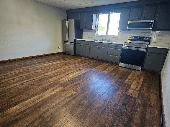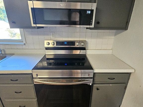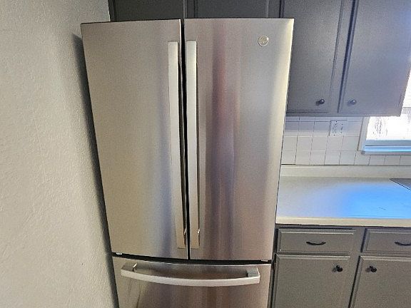 Newer laminate flooringStainless appliancesLarge eat in kitchenMulti spray shower panelTile surround