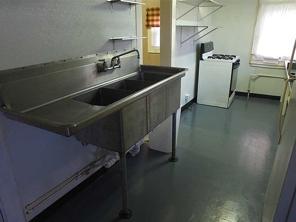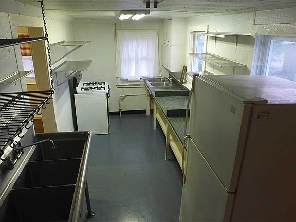 COMMERCIAL KITCHEN set up in this one and a half story home, 2 bedroom, 1 1/2 bath, with optional living quarters upstairs, steel siding & newer windows.