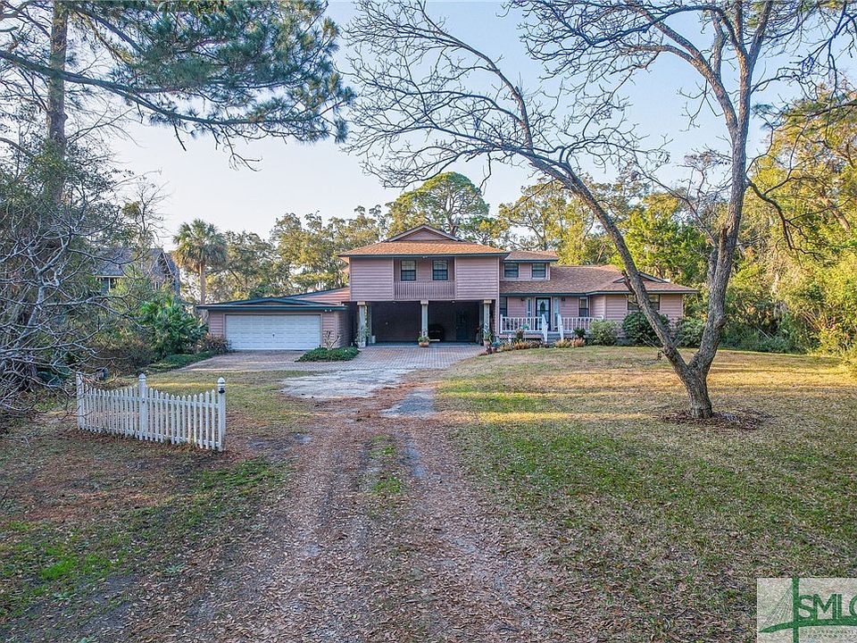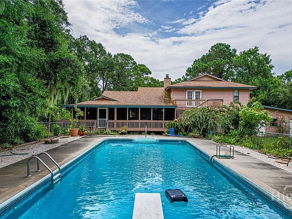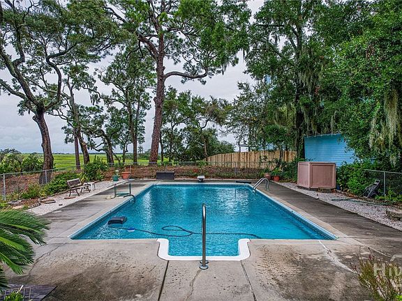 Charming Tybee Island home w/creek & Marsh views nestled on a serene 1.5 acre lot with a long driveway to the home. Owner recently had the trees and brush behind the fence/pool removed to capture a broad view of water and sunsets. INCREDIBLE opportunity to subdivide and build another home or create a multi-generational living space or develop for future resale. This gem offers the perfect blend of privacy, natural beauty & coastal living. This property features a spacious 19x38 swimming pool, ideal for relaxing or entertaining. The home boasts 3 bedrooms, 2.5 baths, and an open floor plan that includes a bright and airy kitchen, dining & living area, highlighted by a cozy wood-burning fireplace. Enjoy the tranquility of nature from the spacious screened-in porch, which overlooks the pool & offers breathtaking sunset views. Other amenities include a two-car garage, a two-car carport & a large air conditioned room off the carport that could be used as a man cave or bonus space. The property also features a dock which is in need of minor repairs. Recent updates include a new motor & timer for the pool, new outside AC unit for upstairs, newer roof & the home has been well maintained. Spanish Hammock neighborhood is in unincorporated Chatham County and does not pay City of Tybee taxes & HOA is voluntary.
