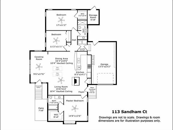 - Rooms: Dining Room, Kitchen, Bedroom 2, Bedroom 3, Carolina Room, Master Bedroom, Garage, Living Room, Storage Area, Laundry