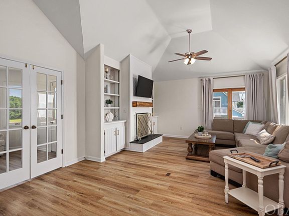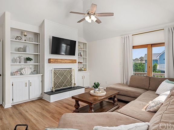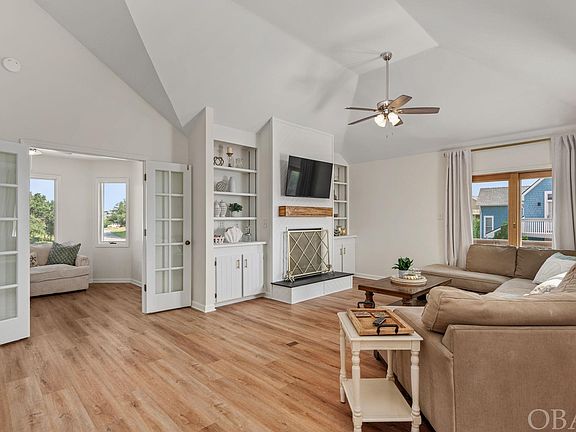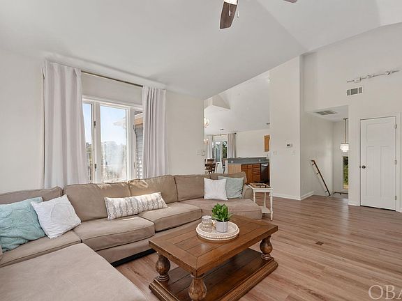 This custom 4-bedroom, 3-bathroom home offers over 2000 square feet of living space in a sought-after location. Situated on an elevated, cul-de-sac lot in an X flood zone, this home is just minutes to the beach, the sound, the Bay Dr multi-use path, and the vibrant shopping, dining, and attractions of Kitty Hawk. Recently updated with a new roof, LVP flooring, and a fresh coat of interior paint, this well-maintained primary home is ready for you to move in. The upper level boasts an open floor plan, featuring attractive and durable Luxury Vinyl Plank flooring, cathedral ceilings, and abundant natural light from large windows and sliding doors. The kitchen features a new gas stove and maple cabinetry, while the focal point of the cozy family room is a wood-burning fireplace with a slate hearth. Enjoy two distinct dining areas: an intimate space for smaller gatherings and a larger area for formal occasions, each adorned with updated chandeliers. The first of the four bedrooms is on this level and is currently used as a sitting area. It is accessible via mullioned French doors and connects to the expansive wrap-around porch. A full bathroom on this level ensures convenience. On the mid-level there are an ensuite bedroom and two guest bedrooms, all with new carpeting. The ensuite offers a spacious retreat with deck access and a private bathroom featuring a double bowl vanity. The guest bedrooms also open to the covered deck, with a full hall bath for added ease. On the ground level there is a practical laundry area with storage and a dry entry from the garage for easy grocery unloading on rainy days. A separate workshop/storage area provides ample space for beach or fishing gear, while a heated bonus room off the garage offers versatile possibilities as an office, studio, gym, or game room. Discover the perfect blend of comfort and modern updates in this inviting Kitty Hawk Bay Ridge home. Whether you’re searching for a primary residence, a second home getaway, or a promising investment property, this move-in ready gem has you covered. Don’t miss this chance to own a piece of paradise in a desirable location.